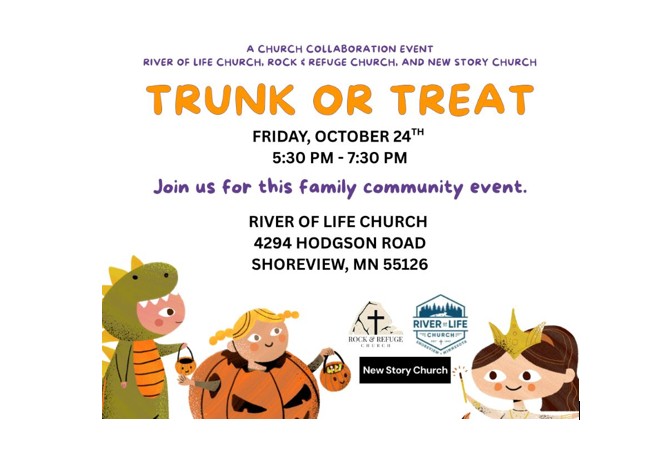 We are excited to co-host Trunk or Treat this year with River of Life Church and New Story Church.